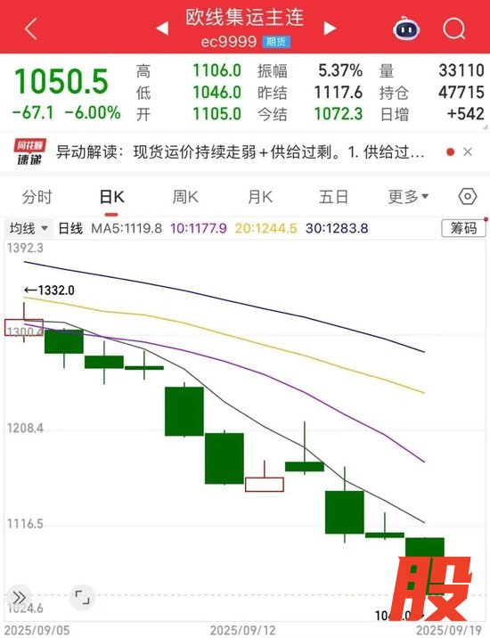 本周,集运指数(欧线)期货(下称集运指数)价格持续下行,截至周五收盘,主力合约大跌6%,至1050.5点,最近10个交易日已下跌20.13%。
