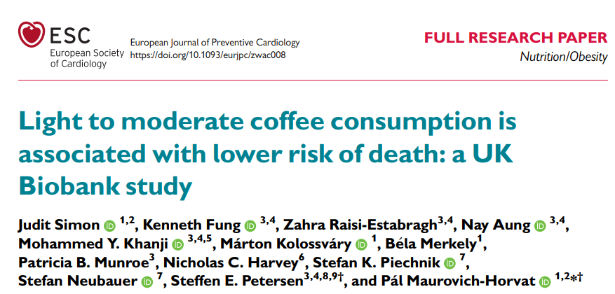 近日,匈牙利塞梅尔维斯大学和英国伦敦玛丽女王大学的研究人员在《欧洲预防心脏病学杂志》上发表了一篇题为" Light to moderate coffee consumption is associated with lower risk of death:a UK Biobank study "的研究论文。