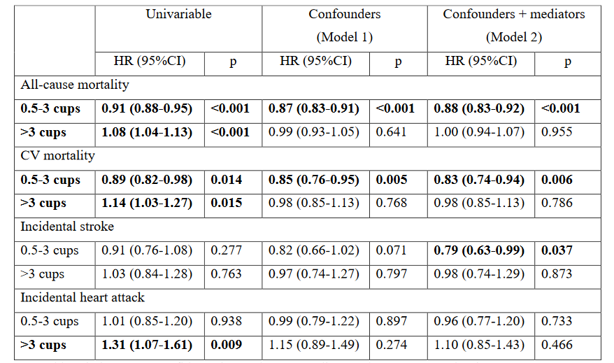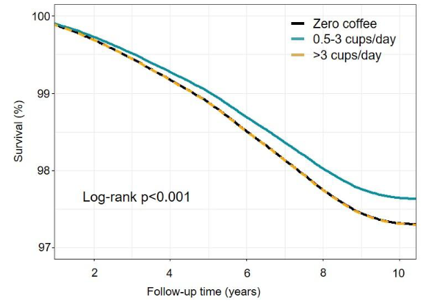 该研究表明,每天喝0.5-3杯咖啡,对心脏健康有保护作用,有助于降低全因死亡、心血管疾病死亡和中风风险。